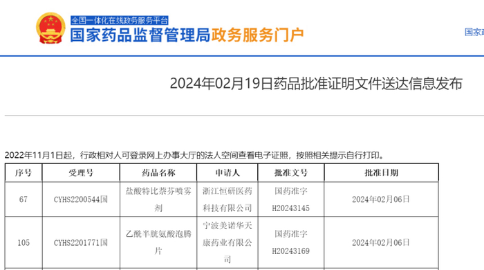 百诚医药通过专业、高效的技术服务,助力合作伙伴浙江恒研医药科技有限公司“盐酸特比萘芬喷雾剂”,宁波美诺华天康药业有限公司“乙酰半胱氨酸泡腾片”上市申请获得国家药监局批准。