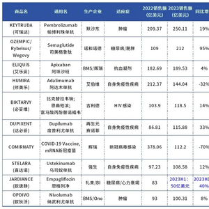 在制药行业,年销售额超过10亿美元的品种可称为“重磅炸弹”,而随着药价的不断上涨,2023年全球销售额排名前十的品种(按通用名计)销售额都达到了百亿美元,药品市场已进入百亿美元时代。