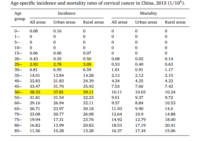 据中国宫颈癌发病率数据显示,从25岁开始,女性宫颈癌的发病率呈现上升趋势,在50-54岁达到高峰。