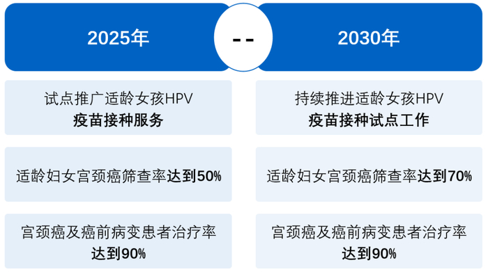 2023年1月5日,国家卫生健康委、全国妇联等10部门联合印发《加速消除宫颈癌行动计划(2022—2030年)》,计划中明确以下目标: