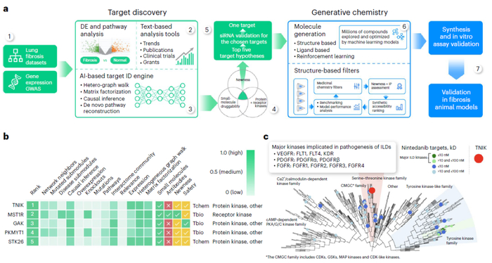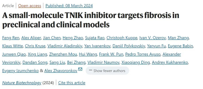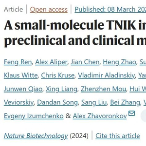 日,英矽智能(Insilico Medicine)公司科学家领衔的研究团队,在Nature Biotechnology上发表了该公司利用生成式人工智能(AI)平台,发现治疗纤维化疾病的全新靶点TNIK并利用AI技术开发小分子TNIK抑制剂的研究。这款TNIK小分子抑制剂目前已经通过了人类1期临床试验的检验,正在2期临床试验中接受评估。值得一提的是,利用人工智能,研究人员只用了大约18个月的时间就完成了从发现靶点直到临床前候选药物提名的研究过程,体现了该公司生成式AI驱动药物发现平台的能力。