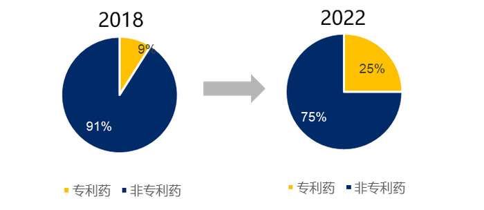 近10年中国创新药行业的加速发展,专利药市场也迎来其红利期。根据中康CMH,2022年,我国非专利药市场规模为10,351亿元,占比75.3%;专利药市场规模为3,401亿元,占比24.7%。对比2018年的份额,专利药在我国药品市场上的份额占比已经提升至1/4。