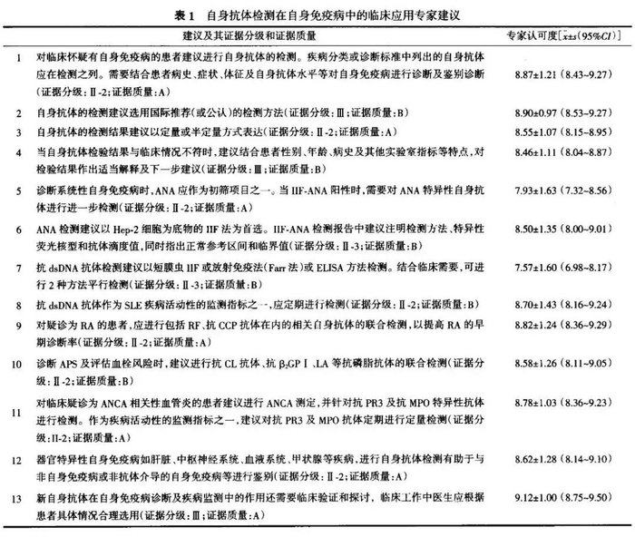 《自身抗体检测在自身免疫病中的临床应用专家建议》(以下简称为《建议》)形成分3步进行。首先由来自全国大型教学医院风湿免疫科医师通过检索国内外文献并结合中国实际情况起草《建议》草案,然后将该草案提交由风湿免疫科、检验科、消化科、血液科、神经内科等组成的专家组讨论,补充和提出修改意见,修改后的草案再次由起草成员讨论,形成初步建议,并对每项建议条目进行解读。最后提交由中国免疫学会临床免疫分会专家进行投票评分(Delphi评分,分值0~10分,0分表示完全不赞同,10分表示完全赞同),计算所有专家打分的x±s作为每条建议的专家认可度。《建议》包括13条,每一条都附有基于GRADE法的证据分级、证据质量和专家认可度及其95%可信区间(95%CI)。