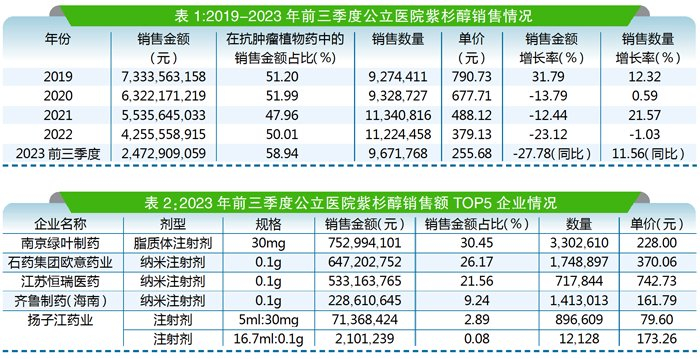根据2023年前三季度的销售情况,预估2023年全年紫杉醇在国内公立医院的销售金额超过30亿元。(本版特约撰稿:尚药)