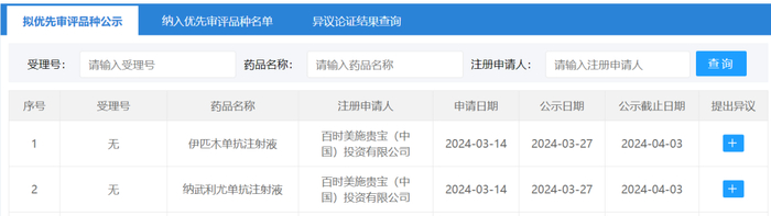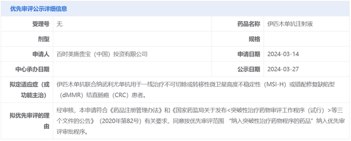 3月27日,中国国家药监局药品审评中心(CDE)官网公示,百时美施贵宝申报的纳武利尤单抗联合伊匹木单抗拟纳入优先审评,针对适应症为一线治疗不可切除或转移性微卫星高度不稳定性(MSI-H)或错配修复缺陷型(dMMR)结直肠癌患者。
