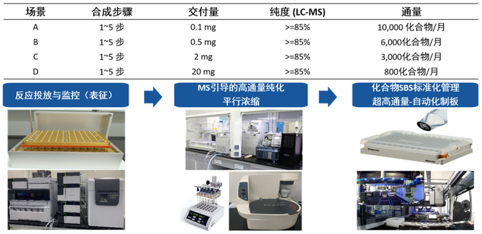 除了能够交付毫克级别(约20mg)化合物以满足传统药物化学筛选与验证需求外,还能提供微克级别(约100ug)化合物以满足药物发现早期或者药物化学早期的探索。在产能方面,该平台每月能够交付800个以上毫克级别化合物,而微克级别化合物的产量可达到每月10,000个,这一数字是传统化学合成所无法企及的。