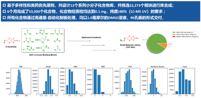 在过去的几个月里,成都先导“一站式”自动化高通量化学合成平台已完成10个处于不同阶段的早期项目。其中,基于多样性的小分子化合物库的交付案例尤为突出,该小分子化合物库包含总计53,000个化合物,涵盖12种骨架和22,273种分子砌块。在这个项目中,所有化合物均配制为1mM的DMSO溶液,以确保在交付后一个月内完成基于某一靶点的表型筛选。筛选结果显示超过1,000种分子被正确检出,并展现出强有效的细胞功能。目前,所有检出的分子正在进行高通量重合成,以准备进行下一步的验证和分子优化工作。