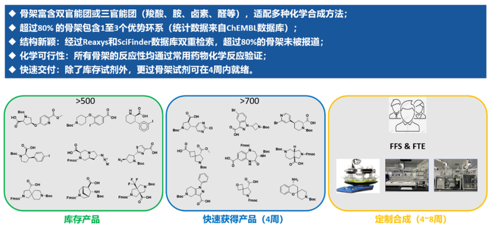 平台拥有超过1,200种类药骨架,80%以上的骨架为全新结构,80%以上的骨架具有1~3个优势环系,并且所有骨架的反应性均得到验证,官能团可兼容大部分药物化学反应。