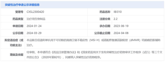 3月29日,中国国家药监局药品审评中心(CDE)官网公示,信达生物IBI310(一款抗CTLA-4单抗)及信迪利单抗(IBI308,抗PD-1单抗)两款产品拟纳入突破性治疗品种,针对适应症为:IBI310联合信迪利单抗用于可切除的高微卫星不稳定性(MSI-H)或错配修复基因缺陷型(dMMR)结肠癌的新辅助治疗。