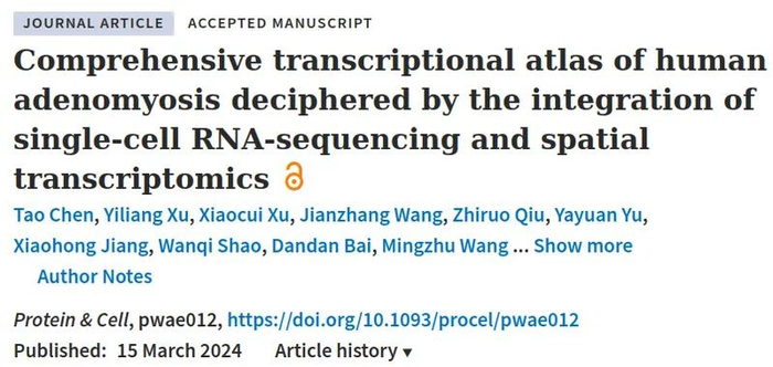 2024年3月15日,嘉兴大学附属妇儿医院的车璇教授团队与同济大学高绍荣教授团队在Protein & Cell在线发表研究论文“Comprehensive transcriptional atlas of human adenomyosis deciphered by the integration of single-cell RNA-sequencing and spatial transcriptomics”。