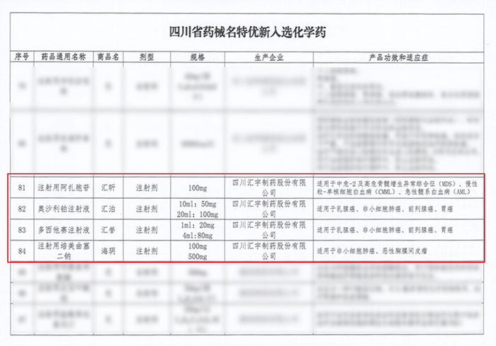 汇宇制药4个产品入选《四川药械名特优新产品名单(2024版)》