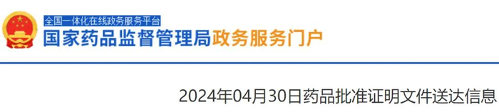 [1]2024年04月30日药品批准证明文件送达信息. Retrieved Apr 30, 2024 from https://www.nmpa.gov.cn/zwfw/sdxx/sdxxyp/yppjfb/20240430111907197.html