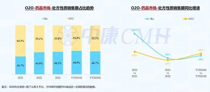 2024年1-2月,中康CMH监测O2O药品市场规模近22亿元,同比增长42%,其中直送店规模增长63%;2月,O2O直送店占线下零售药店占比提升至4.6%。