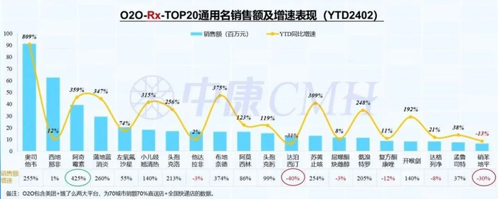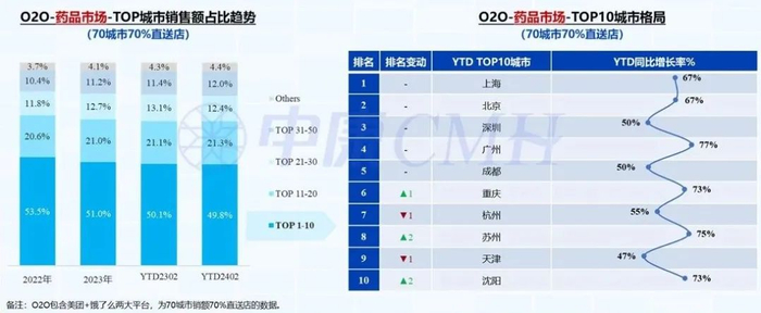 2024年1-2月,O2O市场Top10连锁销售额占比为64.8%,相较去年同期占比提升1.5%;Top10连锁中,大参林、泉源堂、健之佳、一心堂增速较快,排名提升。