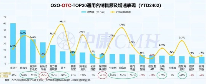 2024年1-2月,O2O药品市场胃肠、皮肤、维矿、两性用药等品类市场规模增速不及整体药品市场;感冒用药领跑药品市场,同比增长269%,主要由奥司他韦、感冒灵、复方氨酚烷胺等驱动。