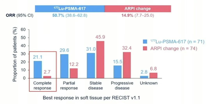 此外,Pluvicto的客观缓解率和完全缓解率均显著高于活性对照组。Pluvicto组的完全缓解率达到21.1%,而对照组只有2.7%。Pluvicto将患者的完全缓解率提高近8倍。研究人员表示,这一积极结果支持考虑Pluvicto作为治疗这一患者群体的新标准疗法。