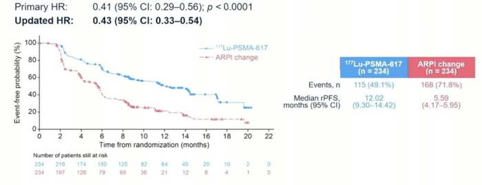 试验结果显示,Pluvicto与更换ARPI药物相比,将患者的放射学疾病进展风险降低57%(HR=0.43,95% CI,0.33-0.54)。Pluvicto组的中位rPFS为12.02个月,活性对照组为5.59个月。
