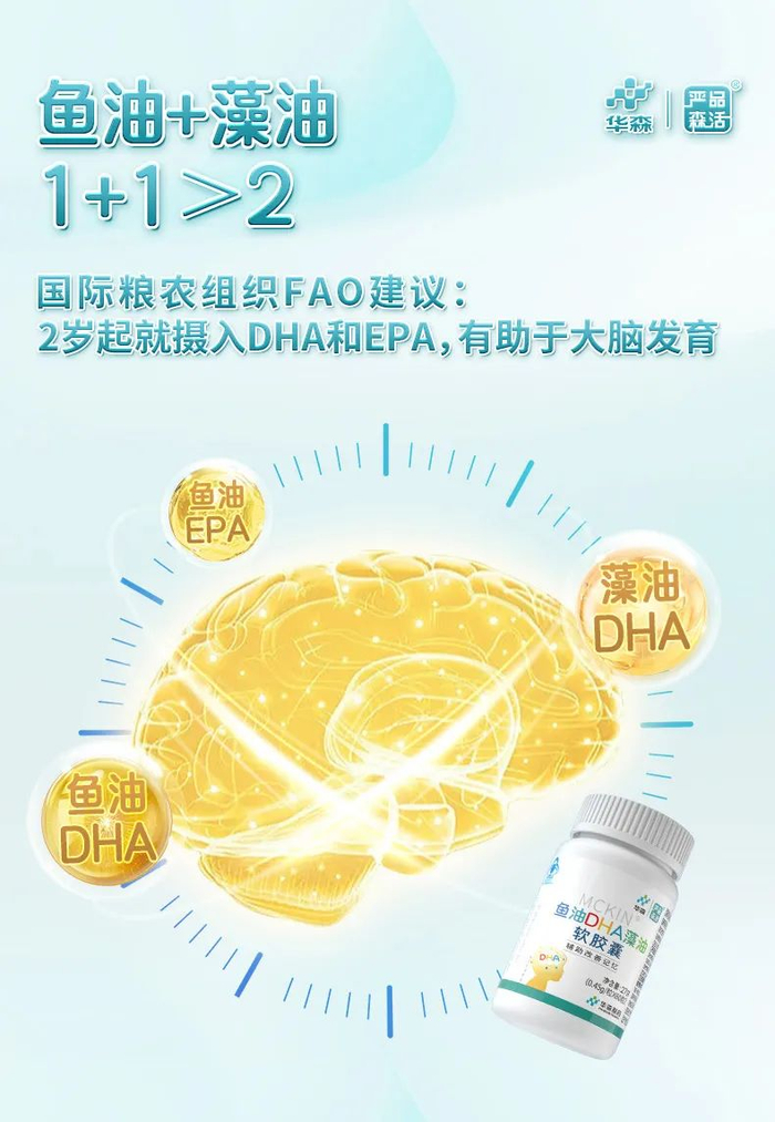 华森制药·严品森活®鱼油DHA藻油软胶囊——改善记忆力,点亮智慧星球,更懂学生营养,以藻油DHA为主、鱼油DHA为辅的双优配方,采用超临界CO2萃取工艺,低温萃取脂肪酸,最大程度减少了萃取过程的营养流失,为DHA缺乏人群提供足量丰富的“脑黄金”。