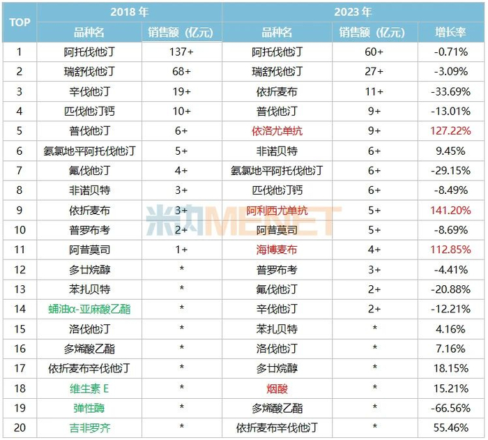 表1:2018年及2023年血脂调节剂TOP20品种对比情况
