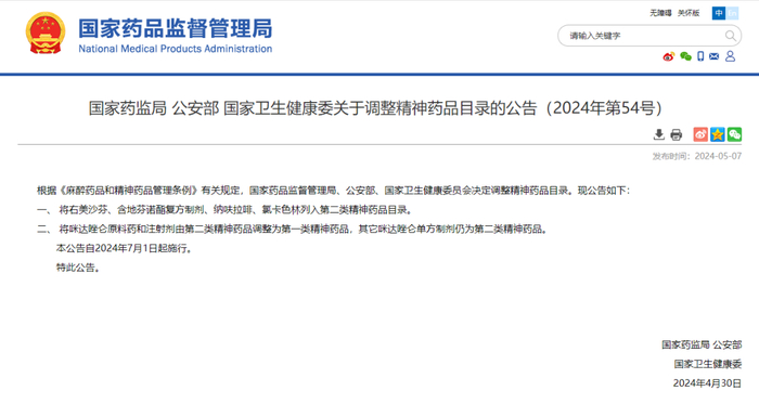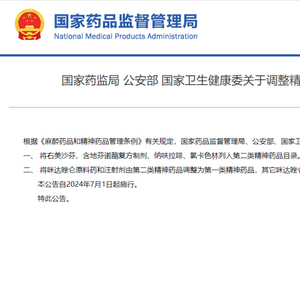 国家药品监督管理局近日发布消息,根据《麻醉药品和精神药品管理条例》有关规定,国家药品监督管理局、公安部、国家卫生健康委员会决定调整精神药品目录。将右美沙芬、含地芬诺酯复方制剂、纳呋拉啡、氯卡色林列入第二类精神药品目录。