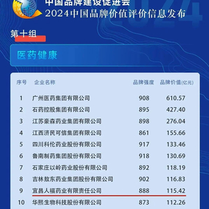 近日,新华社、中国品牌建设促进会、中国资产评估协会等单位联合发布“2024中国品牌价值评价信息”,宜昌人福药业位居医药健康组第9,品牌价值为115.42亿元,较上一年度提升超20%。
