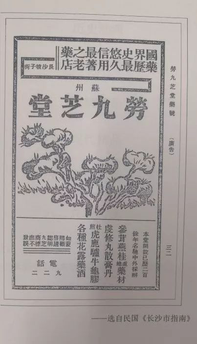 从以下一张绉雅朴素,带民国范儿的报章截图可以看出,民国时期九芝堂就在《长沙市指南》刊登过广告,并已有了图文并茂的注册商标,那九朵灵芝历历可数。其广告语中有“杜煎虎鹿驴牛龟胶”字样,意思是本店亲自煎制虎鹿驴牛龟等各种胶。想见几百年来九芝堂药铺冬春之际,胶香四溢、顾客盈门的盛况。