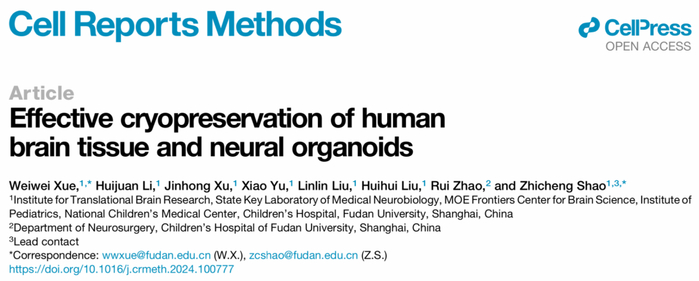 2024年5月13号,复旦大学脑科学转化研究院邵志成研究员团队在Cell Reports Methods杂志在线发表了题为“Effective cryopreservation of human brain tissue and neural organoids”的研究论文,报道了一种被称为MEDY的全新脑类器官冷冻保存新技术,该技术在冷冻过程中能够保留脑类器官的复杂结构和功能活性,保留人脑组织的病理特征。