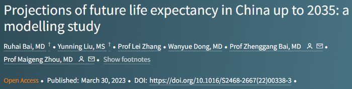 Bai R, Liu Y, Zhang L, Dong W, Bai Z, Zhou M. Projections of future life expectancy in China up to 2035: a modelling study. Lancet Public Health. 2023 Dec;8(12):e915-e922. doi: 10.1016/S2468-2667(22)00338-3. Epub 2023 Mar 30. PMID: 37004714; PMCID: PMC10188127.