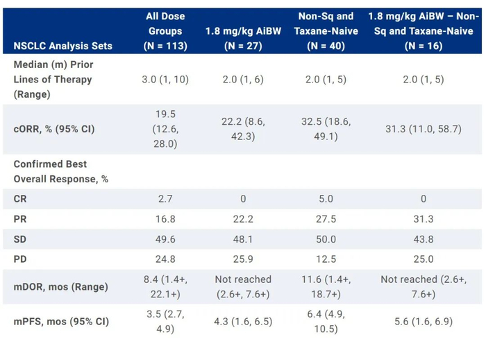 ASCO年会摘要公布的更新结果显示,在1期临床试验中,确认客观缓解率(cORR)为19.5%。而在未接受过紫杉烷治疗的非鳞状NSCLC患者亚群中,cORR达到32.5%。患者详细特征和疗效结果见下图。
