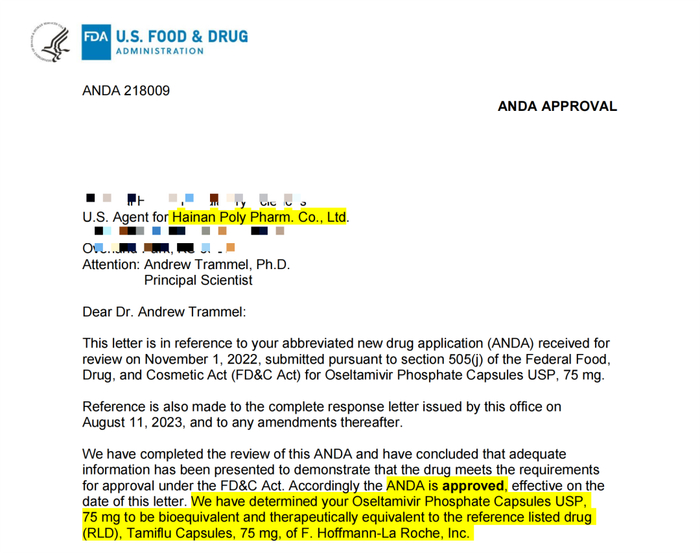 高亮内容翻译:我们(FDA)已确定您(普利制药)的磷酸奥司他韦胶囊(75mg)与参比制剂-罗氏制药达菲胶囊(75mg)生物等效并且治疗等效。