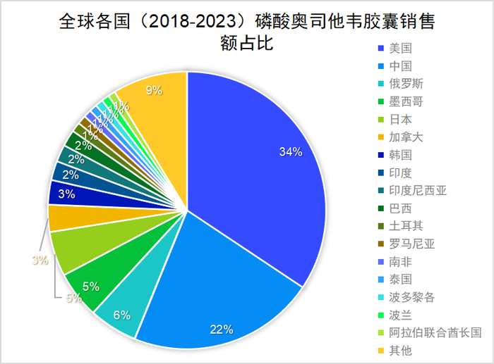 根据IMS显示,全球各国近6年(2018-2023)磷酸奥司他韦胶囊合计销售额前五分别为美国、中国、俄罗斯、墨西哥、日本,其中美国占比达到了34%,约合人民币80亿元。