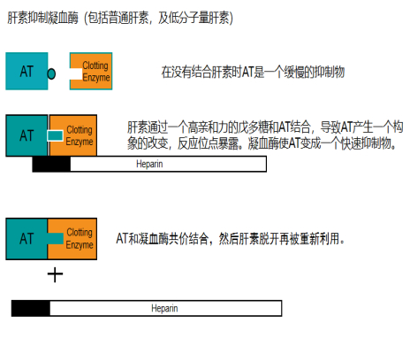 AT是人体内最重要的抗凝物质之一。AT通过与多种活性凝血因子结合发挥抗凝作用,如FⅨa、 FⅪa、FⅫa、FⅦa;其中对 FⅩa 和凝血酶(FⅡa)的亲和力最高。AT发挥抗凝作用涉及抗凝血酶反应位点的构象变化。当肝素存在的情况下,AT所含的赖氨酸与肝素结合后引起AT构象改变,使AT所含的精氨酸残基更易与凝血酶的丝氨酸残基结合。一旦肝素-AT-凝血酶复合物形成,肝素就从复合物上解离,再次与其他游离的AT 结合而被反复利用,继续发挥肝素增强AT抗凝功能的作用。因此,肝素能够提升AT的活性达千倍以上。