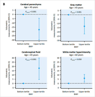 综上所述,高累积BMI与较小的脑容量、较大的白质病变和异常的显微结构完整性相关。建议45岁以下的成年人将体重指数保持在26.2 kg/m2以下,以获得更好的大脑健康。