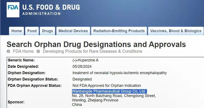 2024年5月31日,万邦德制药集团有限公司宣布,公司主打产品之一,乙酰胆碱酯酶抑制剂【石杉碱甲】获得美国食品药品监督管理局(FDA)授予的治疗新生儿缺氧缺血性脑病(HIE)的孤儿药资格认定。
