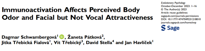 3. Schwambergová D, Pátková Ž, Třebická Fialová J, Třebický V, Stella D, Havlíček J. Immunoactivation Affects Perceived Body Odor and Facial but Not Vocal Attractiveness. Evol Psychol. 2023 Oct-Dec;21(4):14747049231218010.