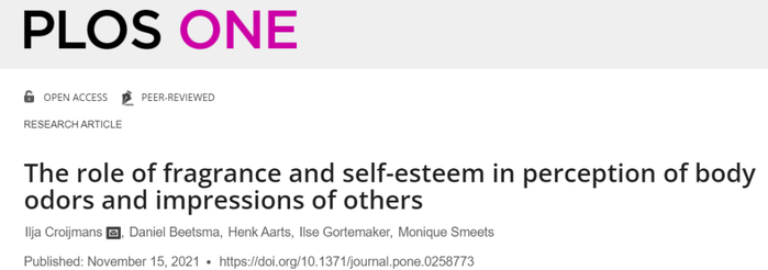 4. Croijmans I, Beetsma D, Aarts H, Gortemaker I, Smeets M (2021) The role of fragrance and self-esteem in perception of body odors and impressions of others. PLoS ONE 16(11): e0258773.
