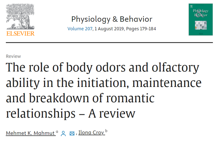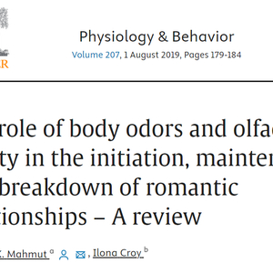 1. Mahmut M K, Croy I. The role of body odors and olfactory ability in the initiation, maintenance and breakdown of romantic relationships–A review[J]. Physiology & behavior, 2019, 207: 179-184.