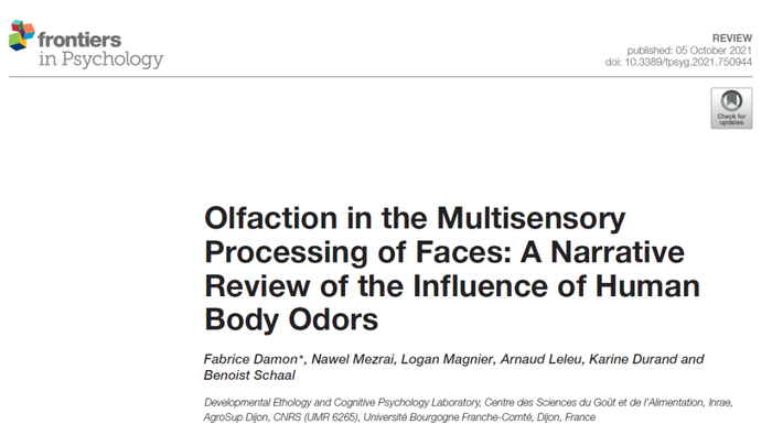 2. Damon F, Mezrai N, Magnier L, Leleu A, Durand K and Schaal B (2021) Olfaction in the Multisensory Processing of Faces: A Narrative Review of the Influence of Human Body Odors. Front. Psychol. 12:750944.