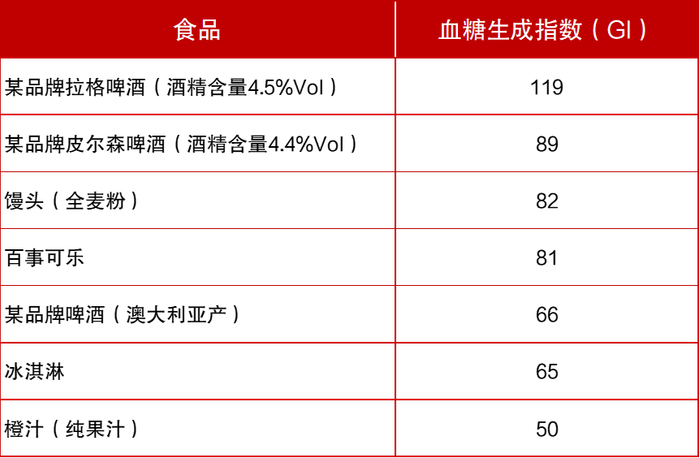 不同的啤酒种类,GI值有所不同。据中国食物成分表(标准版),全球常喝的啤酒中,拉格啤酒(酒精浓度4.5%)的GI值直冲119,即使是相对较低的某啤酒(澳大利亚产)其GI也有66,升糖能力堪比冰淇淋。