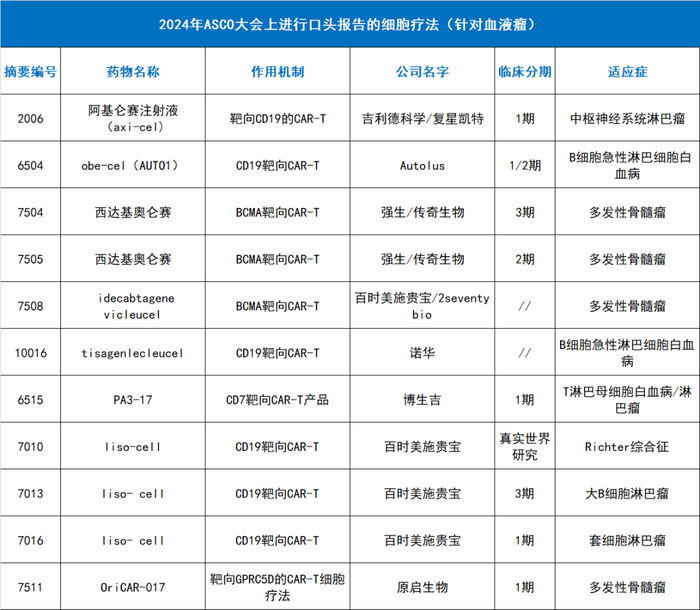 除了上述产品,还有一些其它的细胞疗法入选了本届ASCO大会口头报告,用于治疗不同类型的血液肿瘤(见下表),限于篇幅,此处不再一一介绍。