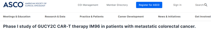 IM96是一款靶向鸟苷酸环化酶2C(GUCY2C)的CAR-T疗法,本次入选口头报告的是该产品治疗转移性结直肠癌患者的1期研究结果。GUCY2C在结直肠癌的所有阶段均异位表达。