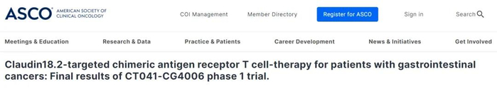 CT041是一种靶向Claudin18.2蛋白的自体CAR-T细胞候选产品,正在针对晚期胃癌/食管胃结合部腺癌的确证性2期临床试验。本次入选口头报告的是一项治疗胃肠道肿瘤患者的1期临床研究数据。
