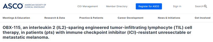 OBX-115是一款保留白细胞介素2(IL2)的工程化肿瘤浸润淋巴细胞(TIL)疗法,该产品使用经FDA批准的小分子药物乙酰唑胺(ACZ)调节膜结合IL15的表达,为TIL的扩增和存续提供细胞因子支持,因此患者在接受该疗法治疗时不需要同时接受高剂量IL2。该产品目前正处于1/2期多中心研究阶段。入选口头报告的是一项1期研究结果,评估了OBX-115方案在ICI耐药、不可切除/转移性黑色素瘤患者中的疗效和安全性。