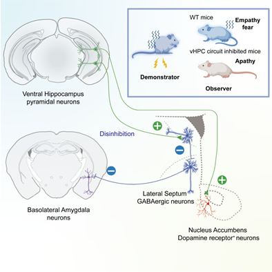 这项研究首次发现,腹侧海马(vHPC)的OF Freeze编码神经元激活背腹侧LS GABA能神经元至BLA的去抑制功能,且BLA作为vHPC→LS→BLA环路中的恐惧效应器调控OF;以及另一个功能独立的环路vHPC→Nac也参与调控OF。这一发现拓宽了情绪共情神经网络的研究,给研究共情相关情绪障碍的潜在机制提供了新的线索。