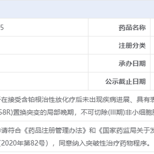 6月7日,中国国家药监局药品审评中心(CDE)官网公示,阿斯利康(AstraZeneca)递交的甲磺酸奥希替尼片已正式被纳入突破性治疗品种,针对的适应症为:奥希替尼用于在接受含铂根治性放化疗后未出现疾病进展、具有表皮生长因子受体(EGFR)外显子19缺失(Ex19del)或外显子21(L858R)置换突变的局部晚期不可切除(III期)非小细胞肺癌(NSCLC)成人患者的治疗。