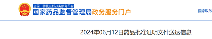 [1].2024年06月12日药品批准证明文件送达信息. Retrieved June 12 , 2024. From https://www.nmpa.gov.cn/zwfw/sdxx/sdxxyp/yppjfb/20240612124002121.html