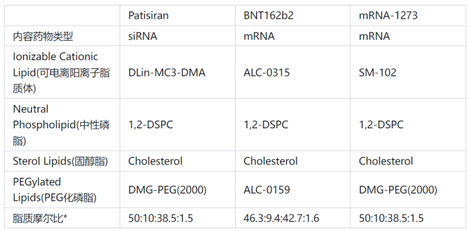 图2 FDA批准的LNPs药物中的脂质摩尔比(*Ionizable cationic lipid : neutral phospholipid : cholesterol : PEGylated lipid)