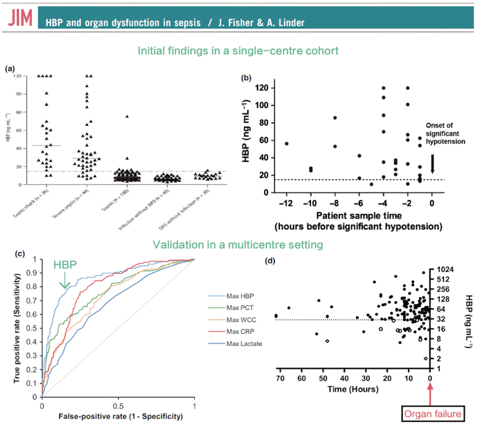 2015欧洲多中心研究发现:在脓毒症发生前72h,即可在患者体内测得HBP浓度增加;在脓毒症发生前10.5h(中位数),大部分患者出现HBP浓度增加。与其它生物标志物相比,HBP是发生器官功能障碍的最佳预测指标,AUC为0.8。
