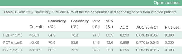 浙江大学医学院附属邵逸夫医院研究发现用HBP从感染患者中诊断脓毒症的cut-off值为28.1ng/mL,此时诊断脓毒症的AUC值为0.893,优于PCT、CRP等标志物。