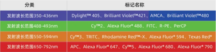 (2)考虑每个荧光基团的激发和发射光谱,最大限度地减少光谱重叠和避免背景干扰也很重要;根据仪器具有的激光激发波长和检测通道选择合适的荧光基团;